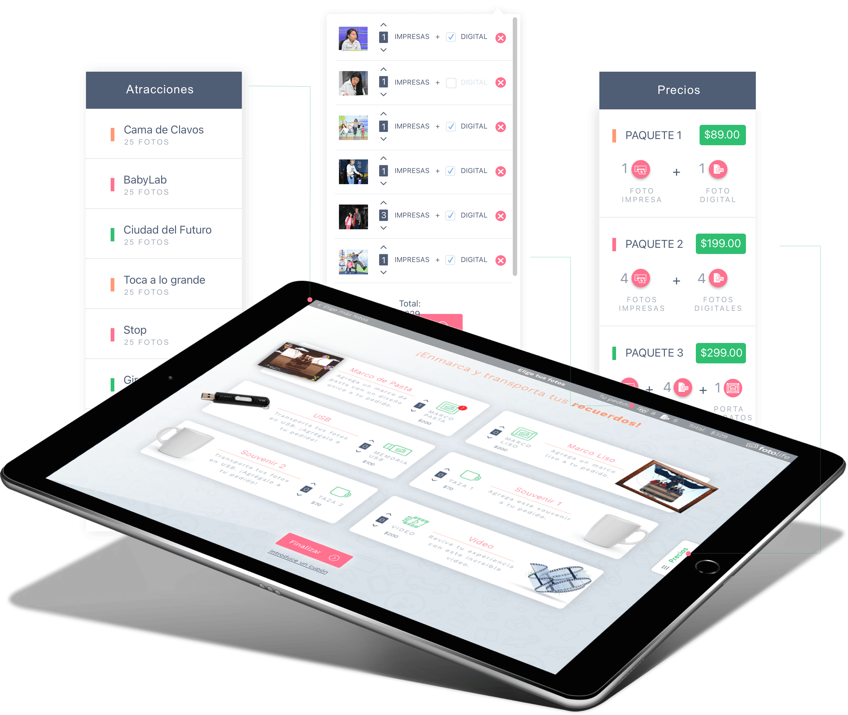 Following this foundation, I worked on the design of a tablet-based selling system that allowed visitors to browse, select, and purchase their photos independently. In parallel, I contributed to the website experience, which acted both as a digital access point for purchased content and as an entry point for potential business partners.